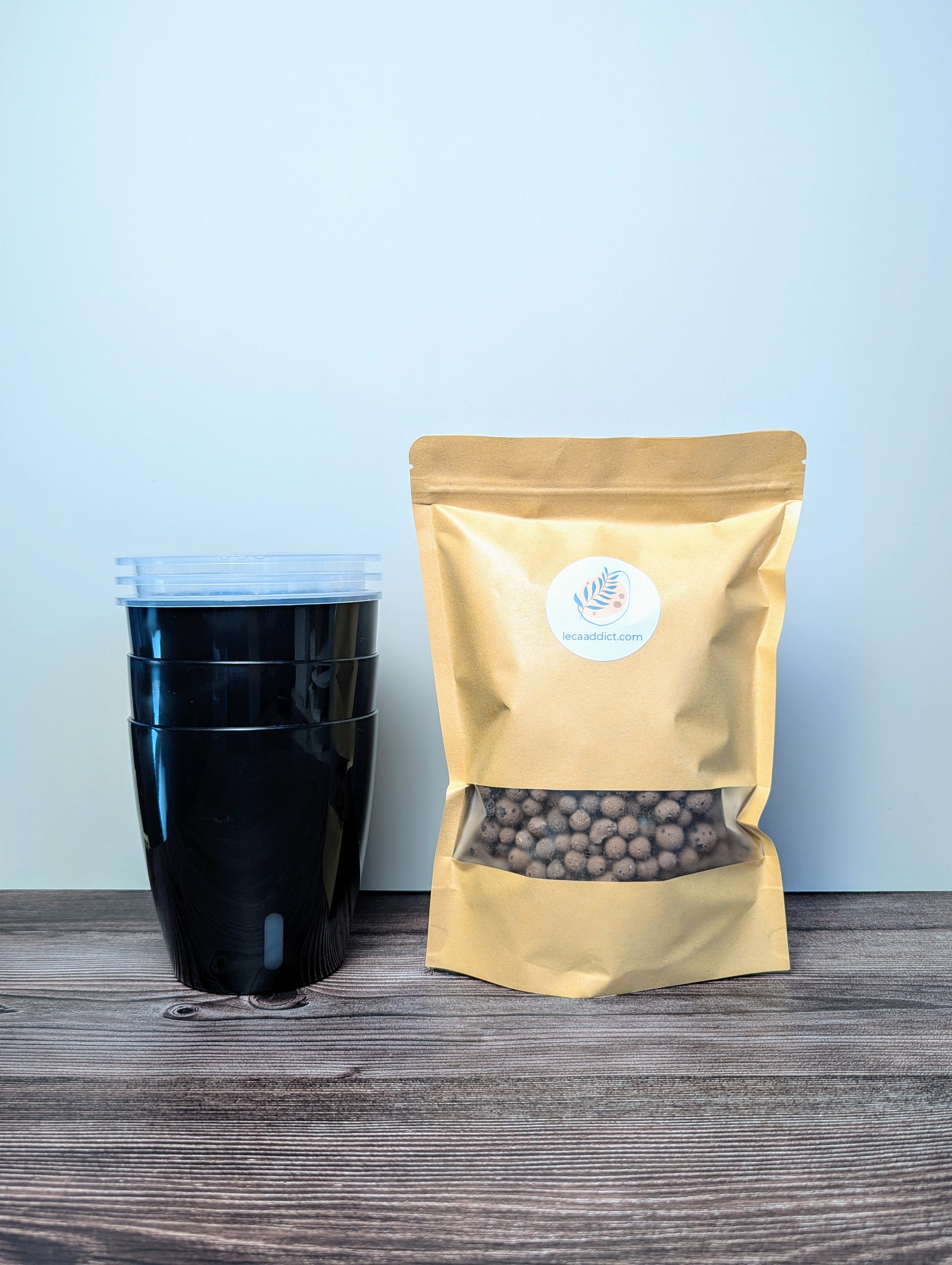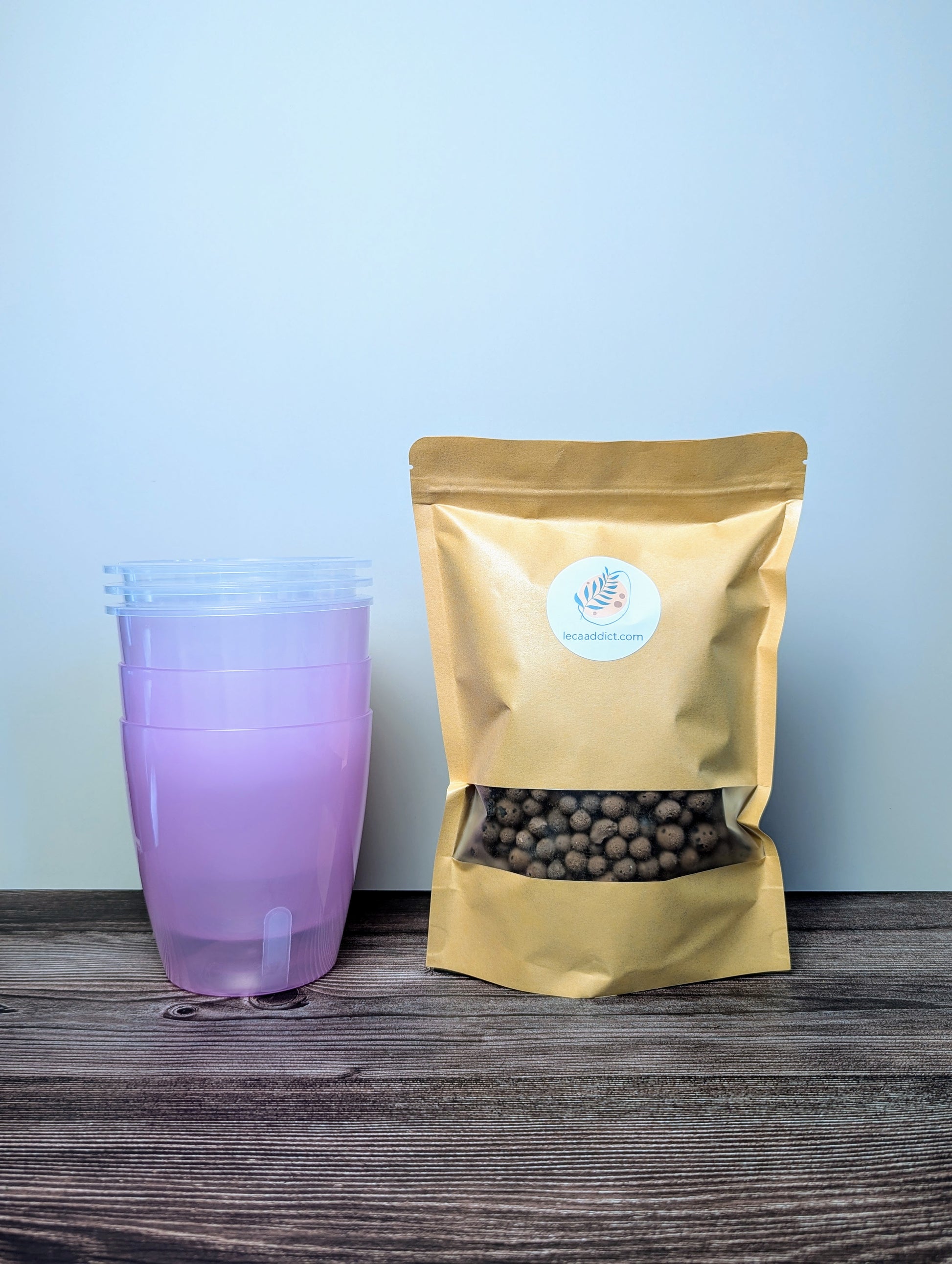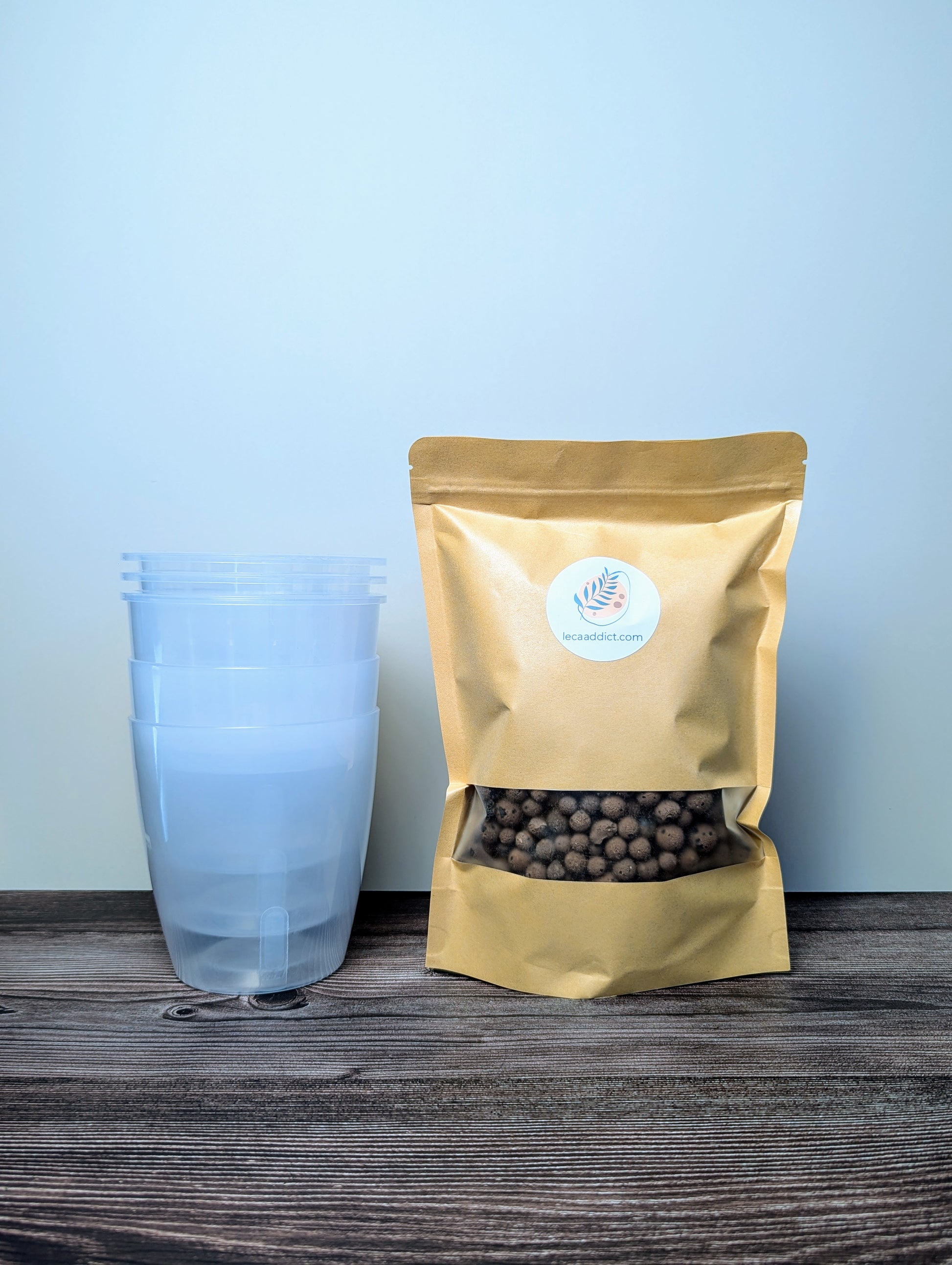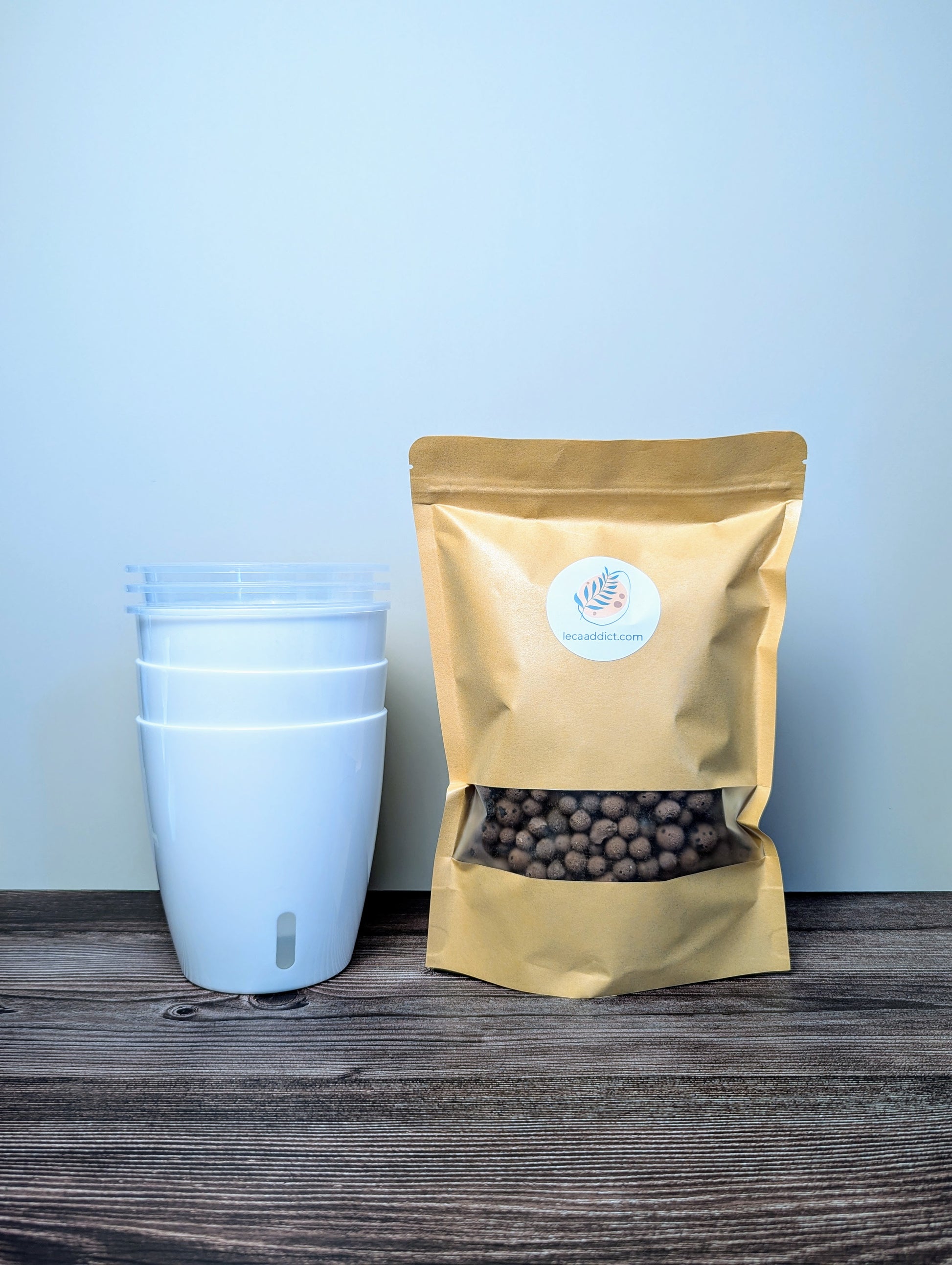 This planting kit comes with 3 self-watering pots in the color of your choosing and a bag of LECA. Enough LECA for 3 plants to thrive, while reducing your plant-care burden. Approximately 1L of LECA in a 7"x 10" bag.